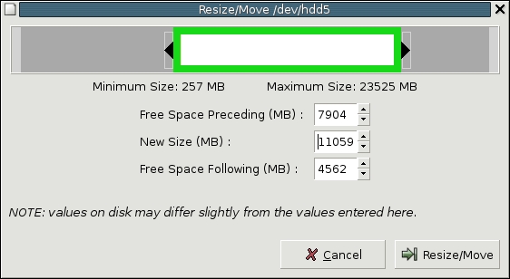 Das oben erwähnte Problem mit der Windows-System-Partition (NTFS) löst man folgendermaßen: man bootet von der GParted Live-CD. Anschließend verkleinert man die Daten-Partition (D:\) bzw. löscht dieses sogar, wenn sie nicht mehr benötigt wird. Im zweiten Schritt vergrößert man die System-Partition (C:\).
