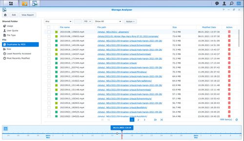 der Synology Storage Analyzer sucht nach Dateien, die einen identischen Dateinamen und eine identische Dateigröße besitzen. Das entspricht lediglich einer Schnellsuche. Man sollte sich nicht darauf verlassen, dass es sich um Dupletten handelt. Theoretisch ist es möglich, dass eine Datei gleich heißt und dieselbe Dateigröße besitzt, aber der Inhalt sich unterscheidet.