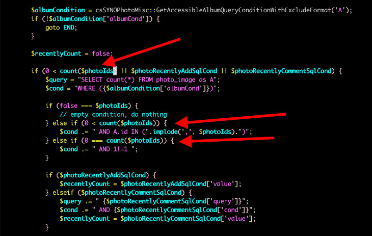 Wir sollten nun folgende Codezeilen finden. Die Fehlermeldung erscheint, weil auf die Variable $photoIds die Methode count() angewendet wird. Wir passen die Stellen an, dass vorher geprüft wird, dass es sich um ein Array handelt:vi /volume1/@appstore/PhotoStation/photo/include/photo/SmartAlbum.php