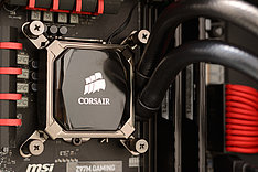 Auch bei der Kühlung haben sich ein paar kluge Köpfe Gedanken gemacht und die Erfahrungen der letzten Jahre eingebracht. Warme Luft steigt nach oben, also wurden zwei Gehäuselüfter an der Gehäusedecke angebracht. Klingt logisch! Beim Prozessor hat man sich an der Kühlerlogik von Notebooks orientiert: hier befindet sich die Kühleinheit direkt an der Gehäusewand. Was optisch wie ein Heatipe aussieht, ist in Wirklichkeit eine All-In-One-Wasserkühlung von Corsair, die die Wärme des Prozessors von der Kühleinheit über die Schläuche an den Radiator weitergibt. Somit kommt die Wärme erst gar nicht ins Gehäuse.
