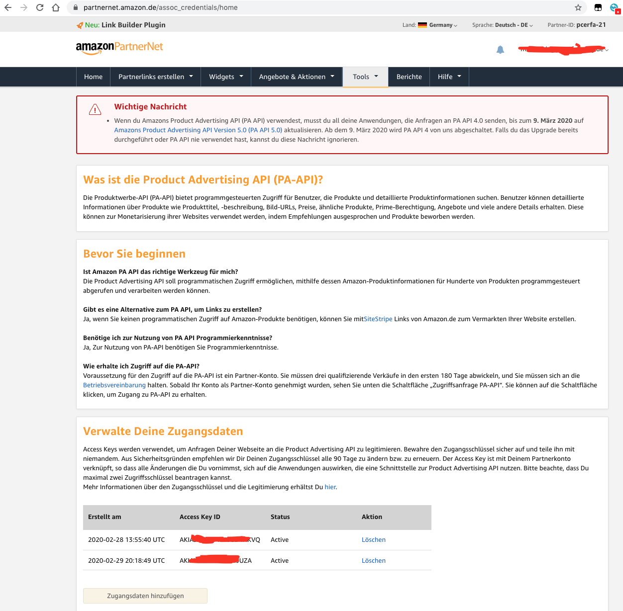 Die Credentials zu finden, ist etwas schwerer als gedacht. Dazu loggt man sich im Partnernet ein und klickt unter TOOLS auf Product Advertising API: https://partnernet.amazon.de/assoc_credentials/home