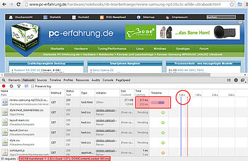 Den beschriebenen zeitlichen Ablauf des Seitenaufrufs kann man mit der Page Speed Browser-Erweiterung hervorragend nachvollziehen. Das Page Speed Plugin zeigt in chronologischer Reihenfolge an, welche Inhalte wann und wie schnell geladen werden. Daraus lassen sich vor allem erkennen, ob