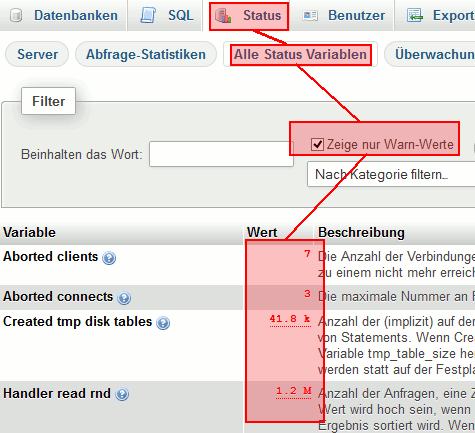 Eine weitere, aber weitaus komplexere Hilfestellung bieten die MySQL-Serverstatistiken. Hier wertet MySQL sämtliche Datenbankabfragen aus und bietet Vorschläge im Bezug auf die Programmierung und der Konfiguration des MySQL-Servers selbst. Wer Indizes bei Tabellen falsch einsetzt oder diese sogar vergessen hat, dem wird MySQL einen hohen Wert bei "Handler read next" haben, da MySQL die gesamte Tabelle scannen muss anstatt auf den Index zuzugreifen.