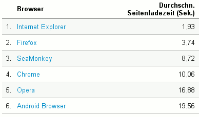 Die obige Grafik aus Googles Analytics zeigt die durchschnittliche Seitenladezeit in unterschiedlichen Browsern. Hieraus lassen sich indirekt die Plattformen (PC, Smartphone usw.) auslesen. So lassen sich die hohen Werte im Chrome und Android Browser damit erklären, dass Smartphone-Anwender sehr lange warten müssen, bis die Seite komplett dargestellt wurde. Wo PC-Anwender 2-3 Sekunden warten müssen, sind es bei mobilen Anwendern 10-20 Sekunden!