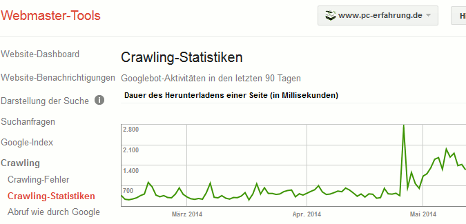 Der Grund für diesen Artikel ist die Webseite www.pc-erfahrung.de selbst. Die installierte Typo3-Version 4.3 vollrichtet seit Monaten problemlos ihren Dienst bis plötzlich und ohne eigenes Verschulden die durchschnittliche Seitenladezeit von ca. 0,3 auf über 1,2 Sekunden anstieg. In den Webmastertools stieg die Dauer zum Herunterladen einer Seite deutlich an und auch Googles Online Page Speed Insight gibt eine Server Antwortzeit von 1,2 Sekunden an. Diese Werte sind definitiv zu hoch. PC-Erfahrung.de ist von den drei installierten Webseiten die mit Abstand meist frequentierte Seite.