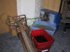 Als Pumpe sollte mir eine Zirkulationspumpe aus dem Trinkwasserbereich dienen (Wilo Z15). Als Ausgleichsbehälter sollte einfach ein auf den Kopf gestellter Behälter dienen in welchem die Luft verbleibt während des Betriebs. In meinem Fall war es nur ein größeres, geschlossenes Rohrstück. Die Idee den Turm auf eine kräftige Kupferplatte zu schrauben habe ich aufgrund der fehlenden Platte verworfen und statt dessen die unterste Rohrschlange so verlegt das sie gleichzeitig als Standfuß diente. Nach zwei Tagen Arbeit war der Turm dann fertig.