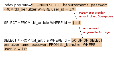 Beispiel: Die URL wird wiefolgt geändert: index.php?aid=50 UNION SELECT benutzername, passwort FROM tbl_benutzer WHERE user_id = 1/*. Das Ergebnis ist, dass Benutzername samt Passwort ausgegeben werden, was ziemlich dramatisch ist.