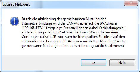 Was bedeutet das? Eigentlich nur, dass Windows für den lokalen Netzwerkadapter die bestimmte IP-Adresse 192.168.137.1 benötigt, so dass die gemeinsame Internet-Nutzung erst möglich ist. Aus diesem Grund erhält der lokale Netzwerkadapter eine neue IP-Adresse. Wer also beispielsweise im lokalen Netzwerk andere IP-Adressen verwendet (bsp. 192.168.0.xxx), der muss diese nun anpassen, sprich IP-Adressen beginnend bei 192.168.137.2 vergeben.